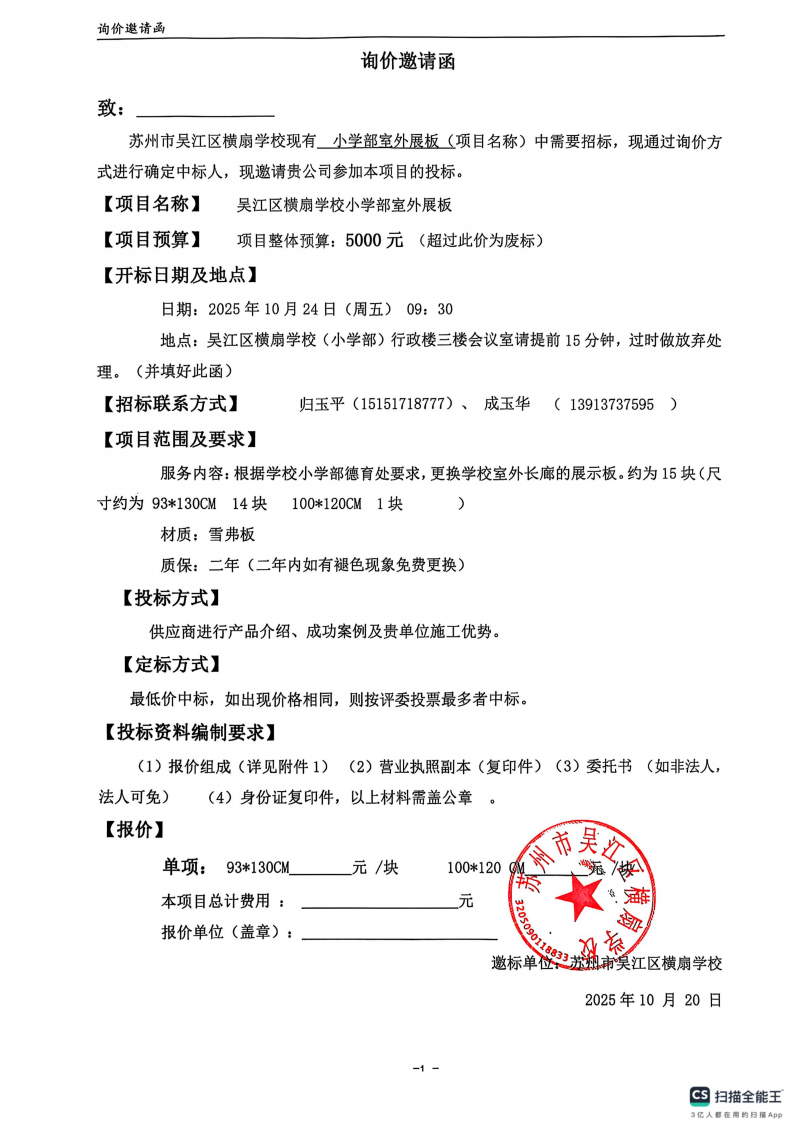 苏州市吴江区横扇学校小学部室外展板询价邀请函公示