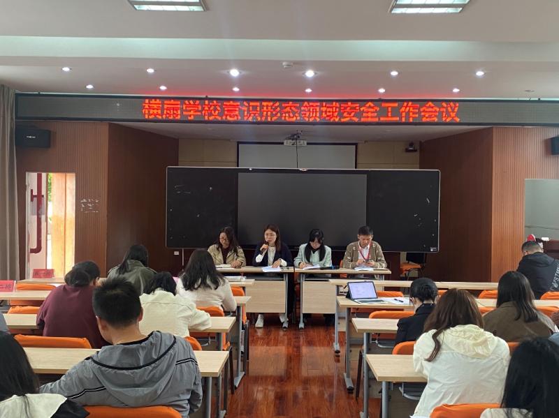 4 月 29 日,横扇学校召开了意识形态领域安全工作会议,主题为“增强意识防微杜渐、筑牢防线强化担当”,会议由成玉华校长主持,全体教师参加会议。