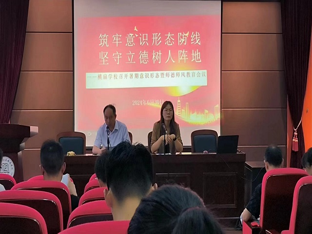 2024 年 6 月 30 日,为进一步加强意识形态工作,筑牢意识形态防线,加强师德师风建设。横扇学校组织召开暑期意识形态暨师德师风教育会议。