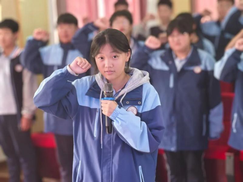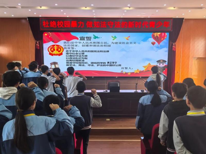 为深化学生对法治的认知,德育处副主任黄成成带来“杜绝校园暴力,做知法守法的新时代青少年”专题教育。课堂上,他详细解读校园暴力的定义、形式与产生原因,用真实案例敲响法治警钟;在宣誓环节,同学们集体庄严宣誓“忠于宪法法律,远离校园欺凌,做守法中国公民”,铿锵誓言彰显了大家知法守法的决心。整个过程中,学生们认真聆听、积极互动,对法治的理解从概念走向了实践,切实增强了自我保护与遵法守纪的意识。