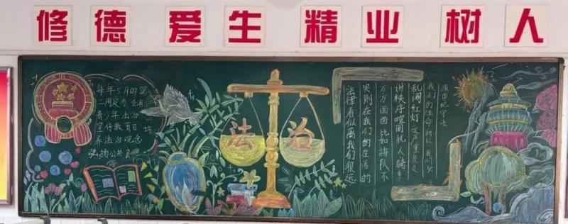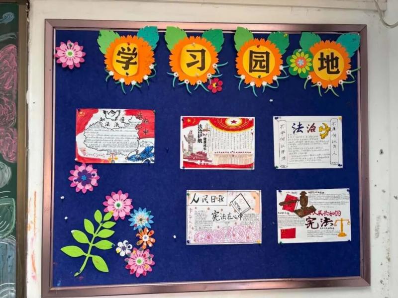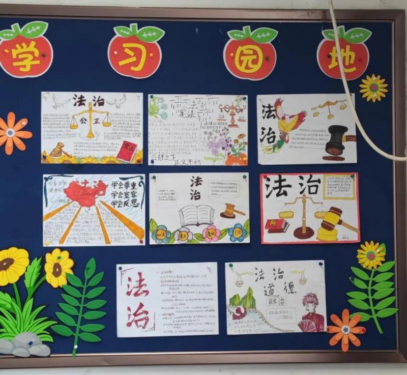 班级是育人的主阵地,横扇学校的各班通过黑板报、学习园地打造沉浸式法治文化空间。有的班级黑板报以“法治”为主题,用生动的图文对比“法制”与“法治”的区别,追溯我国法治建设的历程;有的班级学习园地展示了学生们精心制作的法治手抄报,天平、法槌、宪法等元素跃然纸上,同学们用画笔绘出对法治的理解,让法治精神在班级文化中潜移默化地浸润心灵。这些阵地不仅美化了校园,更成为传播法治知识、弘扬法治精神的窗口。